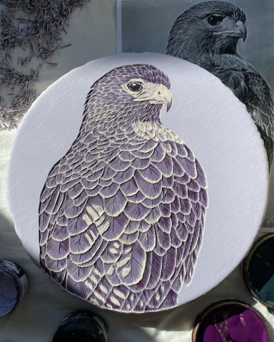 版画のように木の板を彫り刻んで描いた美しい鳥や花の絵 / Hannah Jensen