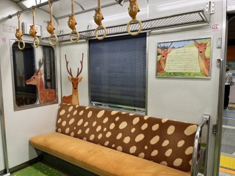 近鉄奈良線を走る、奈良の鹿をモチーフにした列車「ならしかトレイン」です。車内には、中吊りや壁面に鹿の絵柄があしらわれているほか、鹿の形のつり革や鹿の背中をイメージしたシートなどの装飾が