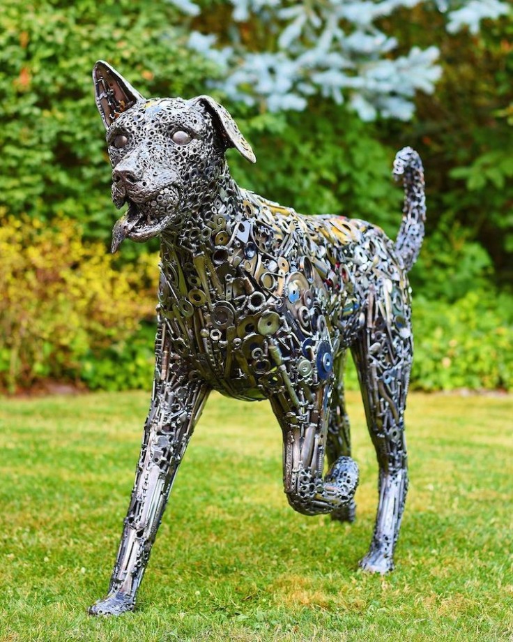 さんが、廃棄された金属スクラップを組み合わせて作った動物の彫刻です。ネジ、ボルト、ナットなど数百もの金属部品のスクラップを溶接して組み合わせ、犬、猫、クマなど等身大の動物の像を作り上げています。