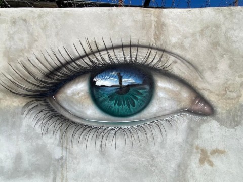 さんが描く大きな瞳の壁画です。国内各地の壁に、町を見守るように見つめるリアルな美しい瞳を描いています。