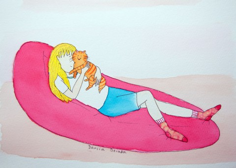 猫との穏やかな暮らしの場面を描いた素朴なイラスト / Dariia Dziuba