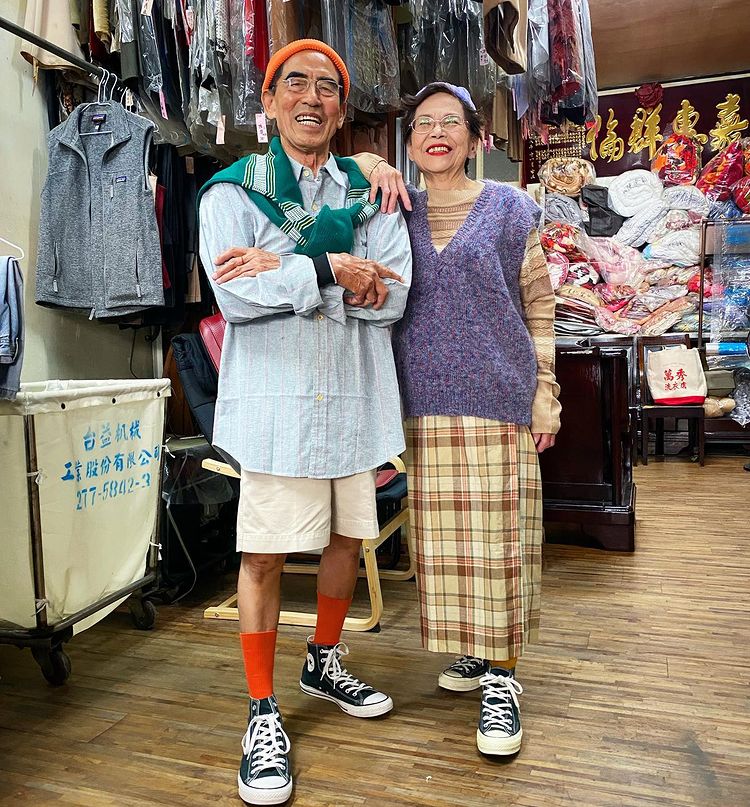 」を営む老夫婦、夫Chang Wan-ji(85歳)、妻Hsu Sho-er(86歳)さんたちが、コインランドリーに客が置き忘れた衣服を着て撮影している2人の写真です。店に置き忘れた衣装を巧みに組み合わせて着こなし、2人でファッショナブルにポーズをとった写真をInstagramに載せています。