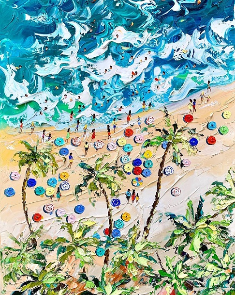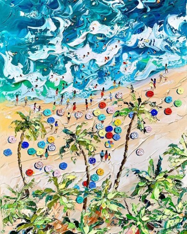 さんが夏のビーチを描いた油彩画です。ペインティングナイフを使った厚塗りで波や砂浜を表現し、カラフルな衣装の人やパラソルで彩られた夏の浜辺を描いています。