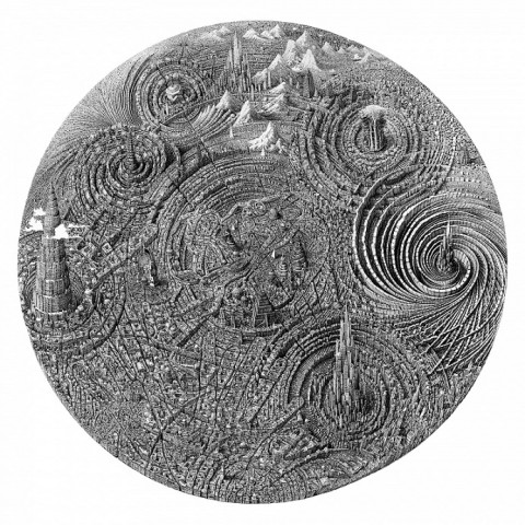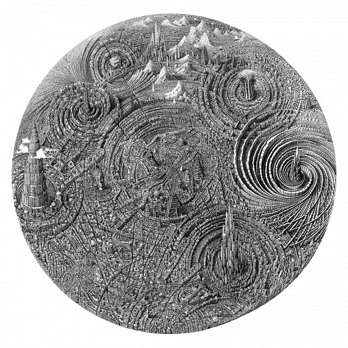 さんが描いた想像上の都市の細密画です。紙にペンだけを使用して、複雑な形の建物が密集する迷路のような都市を細密に描いています。