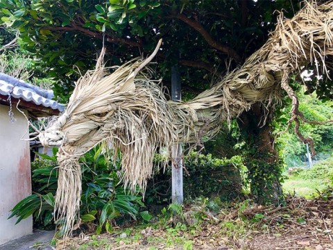 沖縄県うるま市のうるまシマダカラ芸術祭で、宮城島の古民家に展示された作品「龍宮城(リュウ・ミヤギ)」です。地元の作家 Ayako さんが制作。クバ(ビロウ)の藁で作られた迫力ある龍の造形です。