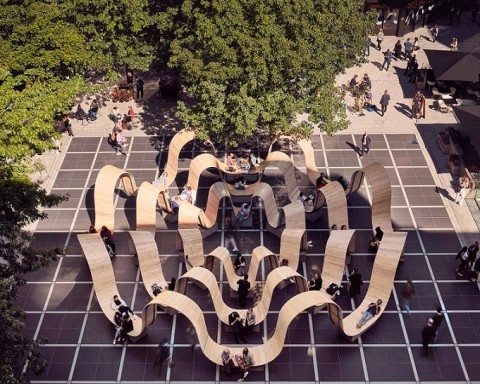 さんが、ロンドン・デザイン・フェスティバルで展示したベンチのインスタレーションです。木の板をつなぎ合わせて起伏のある同心円状の形にして、座ったりくぐり抜けたりできるようにしています。