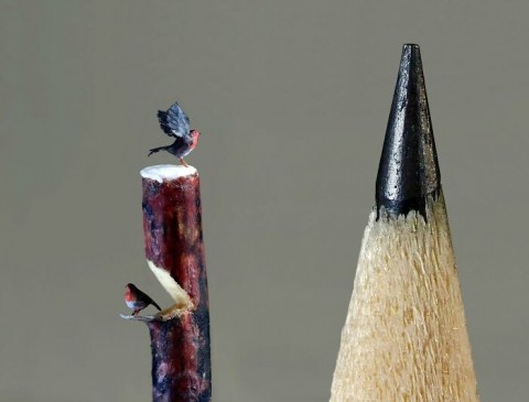 顕微鏡を使い鉛筆の芯を彫ってつくる小さな鳥の彫刻 / Marie Cohydon