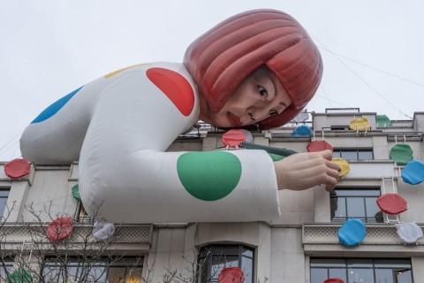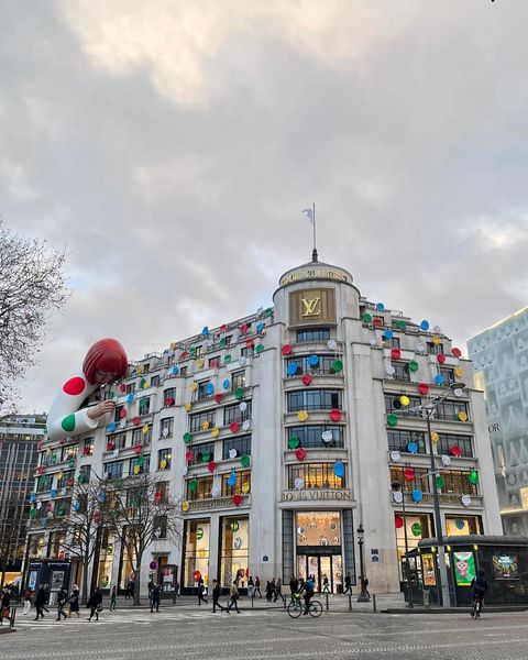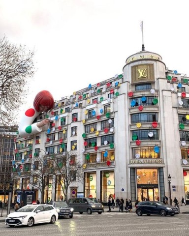 仏パリのシャンゼリゼ通りにあるルイ・ヴィトン旗艦店に出現した、美術作家・草間彌生さんを模した巨大な人形です。ルイ・ヴィトンと草間さんがコラボレーションした商品の発表に合わせて登場。ビル全体も草間さんの代名詞であるカラフルな水玉模様に覆われ、期間限定の装飾が施されています。