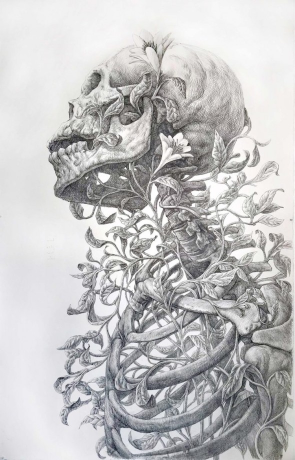 Artist Creates Giant “Memento Mori” Drawing of a Skeleton Filled With Plant Life