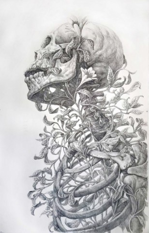 さんが、植物が満ちる人体の骨格を描いたボールペン画です。人体の骨格を生命感あふれる植物で満たすことによって、生と死の対比や自然との連続性を表現しています。