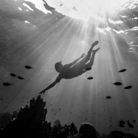 さんが、同国・アロール島の海で遊ぶ子供達を撮影した写真シリーズです。太陽の光が挿し込む海中で遊ぶ子供達を、陰影の美しい白黒写真により写しています。