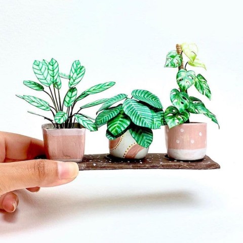 )さんが紙でつくるミニチュアの観葉植物です。葉や茎など形や色をリアルに再現してつくった可愛らしい小さな植物のペーパーアートです。