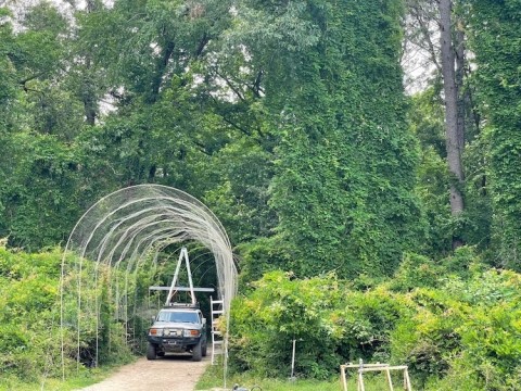 さんが、自宅の私道に伸びてくる植物の剪定にうんざりし、代わりにフレームとネットでトンネルを作ったものです。2022年5月にトンネルを設置したところ、わずか数か月でブドウや藤に覆われて美しい緑のトンネルになりました。