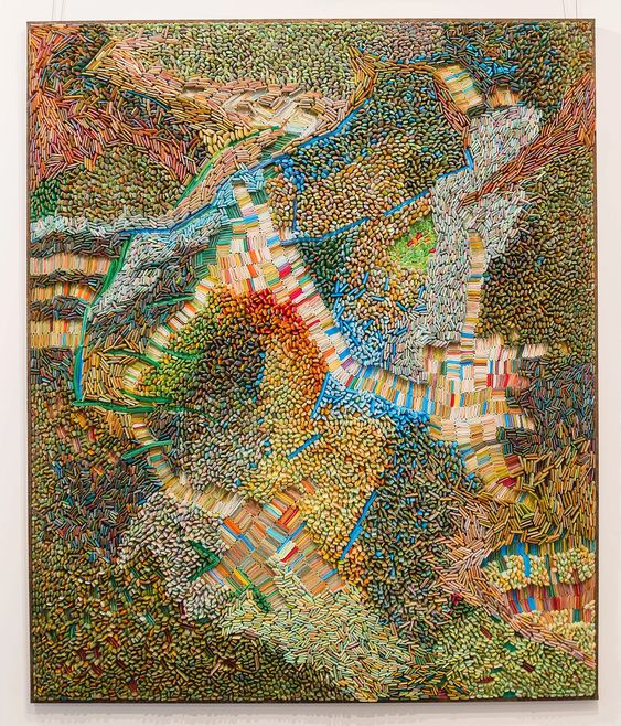さんが、紙で作った種を並べて描いた風景画です。様々な色の紙を丸めて作った種を細密に並べて、上空からの色彩豊かな自然風景を描いています。