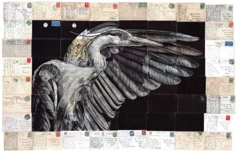 さんが、古いハガキやトランプの上にボールペンで動物や人物の肖像を描いた作品です。古いハガキやトランプカード、地図などの素材に重ねるようにボールペンで緻密な描写で絵を描いて、素材と絵が作用し合うように表現しています。