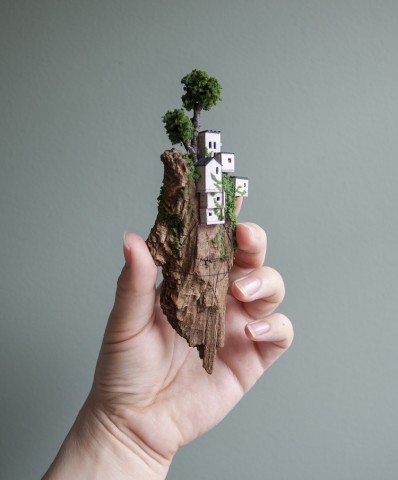 Artist Handcrafts Tiny Floating Islands With Enchanting Little Houses Embedded in Them