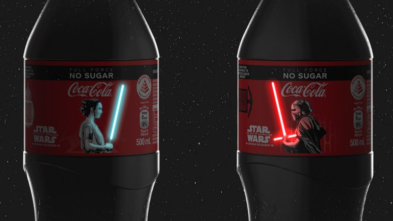 映画スターウォーズの新作公開を記念して、シンガポールのコカ・コーラが限定販売した光るラベル付きのペットボトルです。