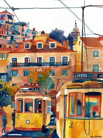 さんが、夏の南ヨーロッパの街並みを描いた水彩画です。リスボン、ローマ、仏ブザンソンなど、夏の南欧の都市を明るく色彩豊かに描いています。