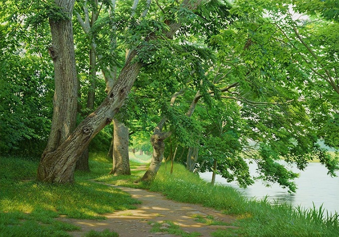木々が立ち並ぶ美しい自然を、まるで写真のように精密な描写で描いています。