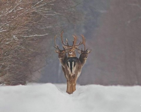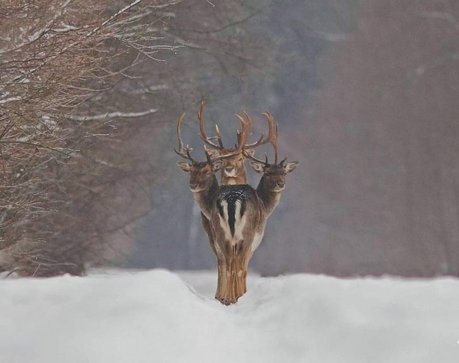 さんが撮影した「三頭の鹿」のように見える3匹の鹿の写真です。リトアニアの冬の森で、鹿たちを後ろから撮影し、偶然、1つの胴体に3つの頭を持っているように見える瞬間を捉えました。