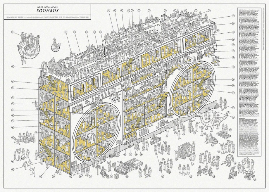 が、1枚の中にヒップホップ音楽の歴史を描いたポスターです。ラジカセを大きな建物に見立て、その中にヒップホップ・ミュージシャンたちの歴史的なラップバトルなどの出来事を緻密に描いて、ヒップホップ音楽の発展の歴史をトリビュートしています。