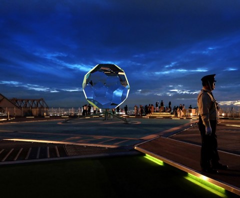 による巨大な球体のレンズです。フレネルレンズで構成された多面体のレンズに映る、断片化された都市の風景を見ることができます。