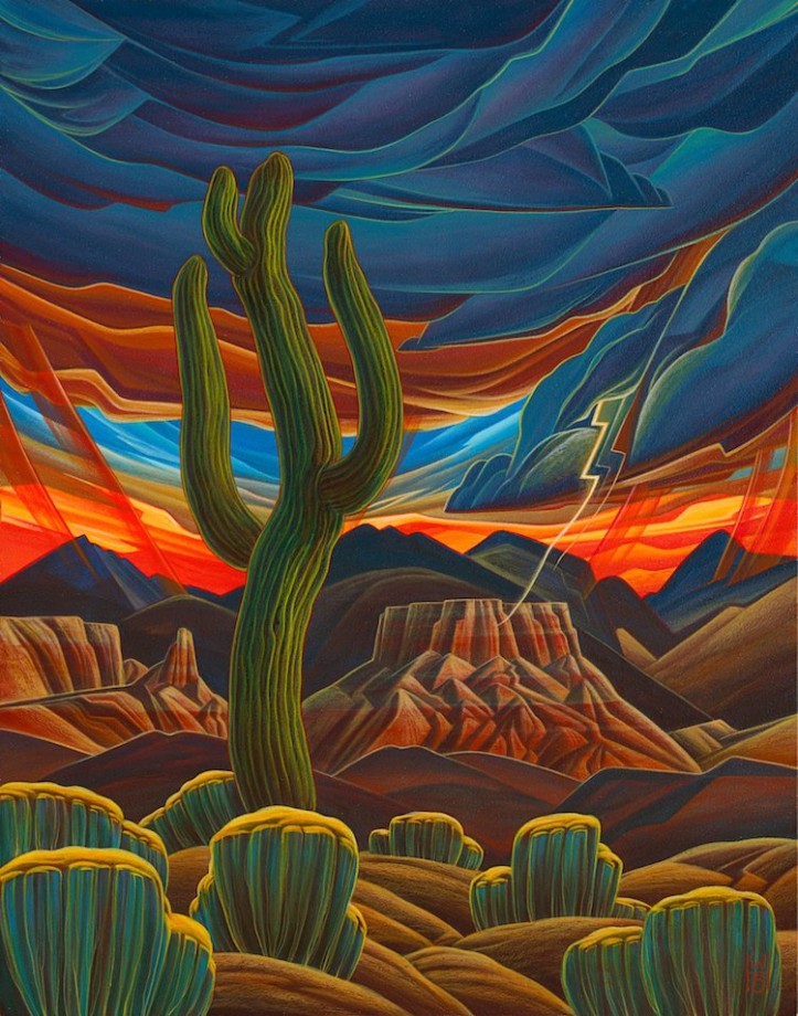 さんが、地元の砂漠地帯の風景を描いた絵画です。山や峡谷、サボテンなどが広がる荒涼とした砂漠の風景を、独特のタッチと鮮やかな色使いで印象的に描いています。