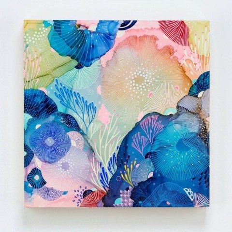 さんが、さまざまな架空の植物などを描いた絵画です。プルシアンブルー(紺青)の顔料やアクリル、ガッシュ絵の具を組み合わせて、幻想的で色彩豊かな架空の生態系の世界を描いています。