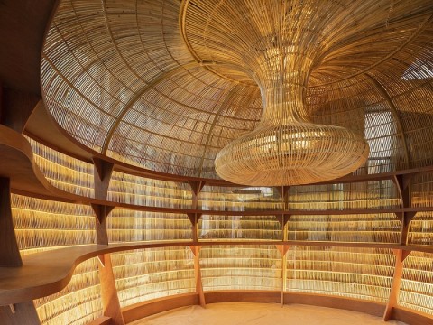 が手がけた、タイ北部チェンマイにあるアート コレクターズ ギャラリーの空間を、うねる藤細工でつないだ作品です。伝統的なタイの職人技と3Dジオメトリによるコンピュータグラフィックスを融合させた、藤を使用したダイナミックで流動的な空間を形成し、従来のアートギャラリーにない温かさと深みをもたらしています。
