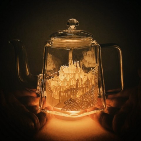 Illuminated Cut Paper Landscapes Encapsulate Enchanting Worlds in Glass Vessels