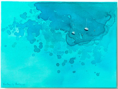 さんがアクリル絵の具と水彩絵の具で描く海の風景画です。空からの視点で、静かな海にヨットが浮かぶ風景をミニマルな表現で描いています。