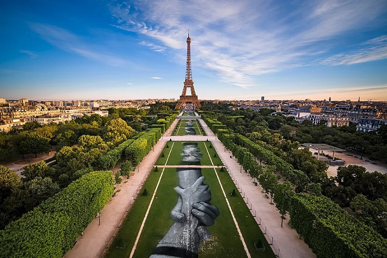 エッフェル塔の公園や山あいに描く巨大な人間の鎖の手 / Saype