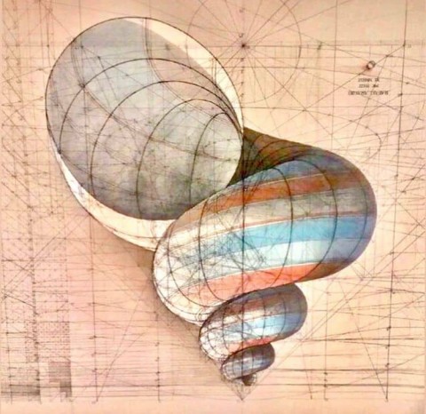 貝殻や蝶の絵に補助線を引いて幾何学的に表現した描画 / Rafael Araujo