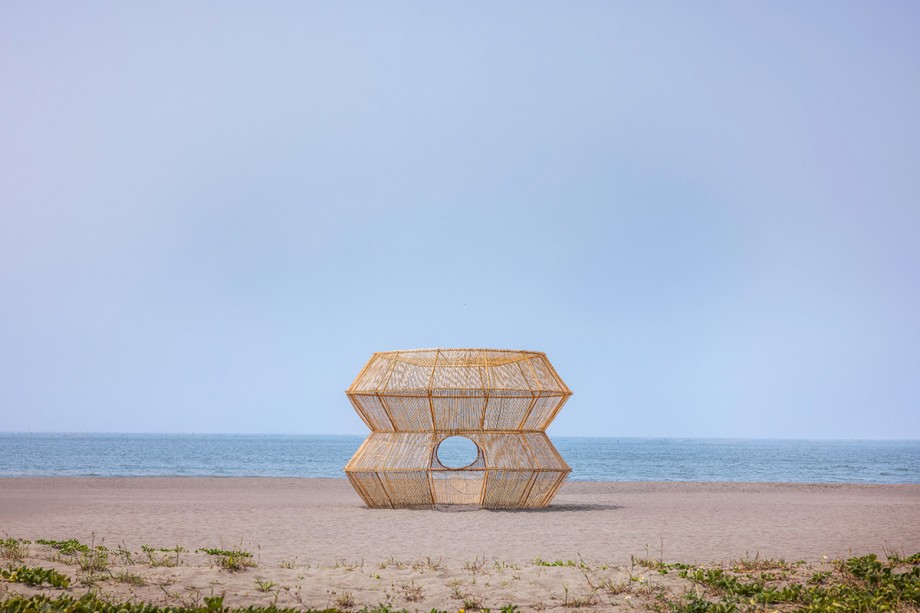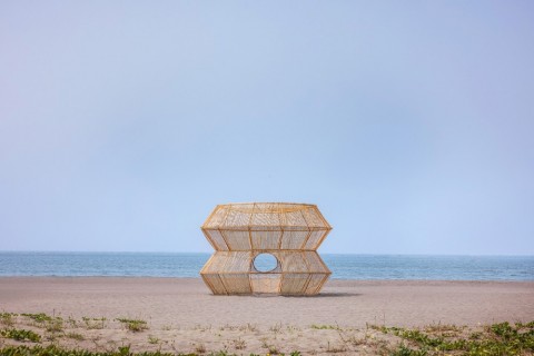 さんが、台湾の伝統的な竹で組んだ魚捕り網に着想を得て作った、巨大な竹の魚網のインスタレーション Fish Trap House です。漁光島の砂浜に、伝統技法により竹ひごを組んで制作した美しいインスタレーション作品を展示しました。