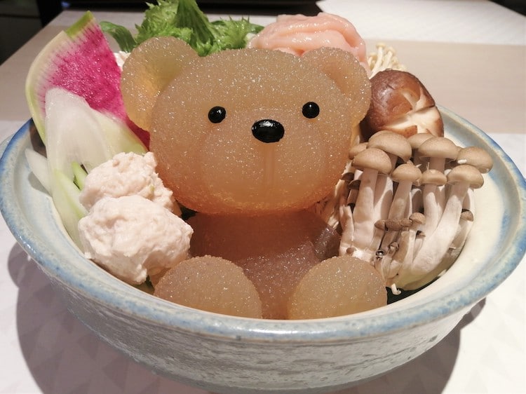 かわいいくまちゃんをしゃぶしゃぶ鍋の出汁にした北海道札幌発の一人鍋専門店「北海道めんこい鍋 くまちゃん温泉」です。くまちゃんは食物繊維とコラーゲンで固めたもので、加熱することでプルプルと揺れながら溶けていき、まるで温泉につかっているかのような様子が可愛らしい鍋です。