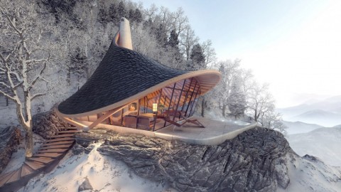 北海道の森に設計した曲線の木製屋根が包む山小屋のデザイン案 / LEAD