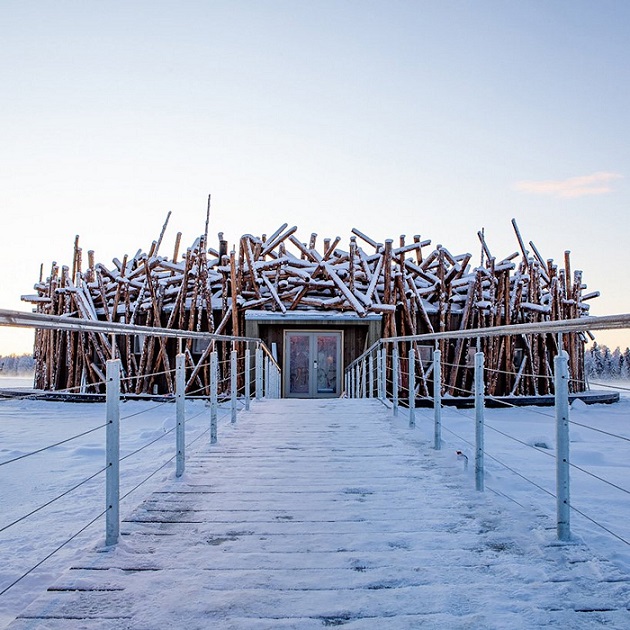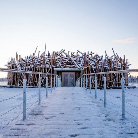 かつてこの川で山から切り出した丸太を運搬していた歴史をモチーフに地元の木材を用いた鳥の巣のような外観とし、夏は川面を漂い、冬は氷の上に立つユニークなスタイルのホテルです。