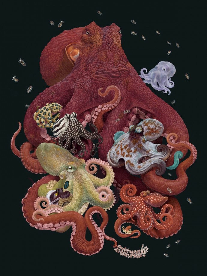 さんが描く海洋生物のデジタル画です。タコやクラゲ、ヒトデ、カニ、タツノオトシゴなど、様々な種が深海に漂う姿を精緻に描いて、生物の多様性を表現しています。