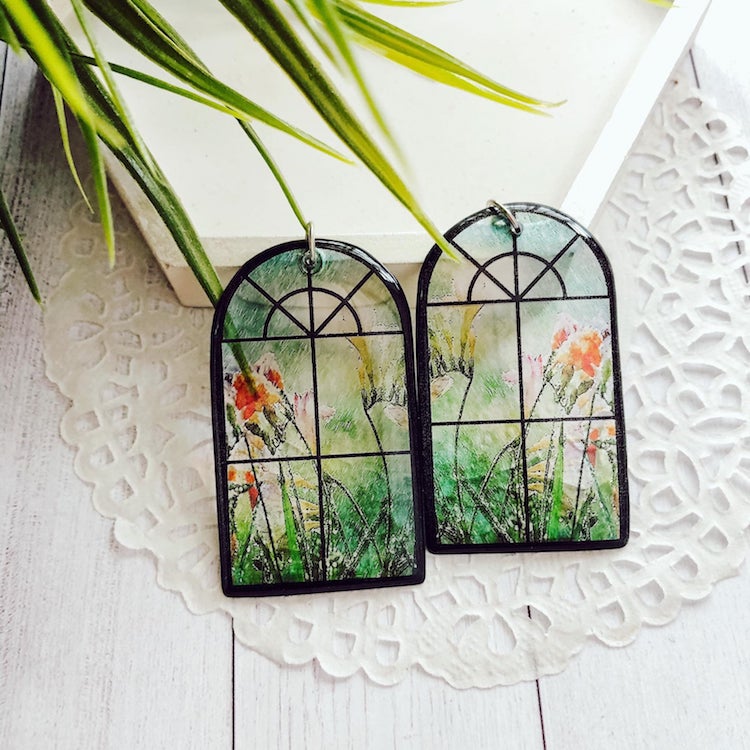 さんが手がけた、ガラス窓をモチーフにしたイヤリングです。透明な樹脂に花や木、建物、雨粒などを描き、アーチ型の窓から見える景色を表現しています。