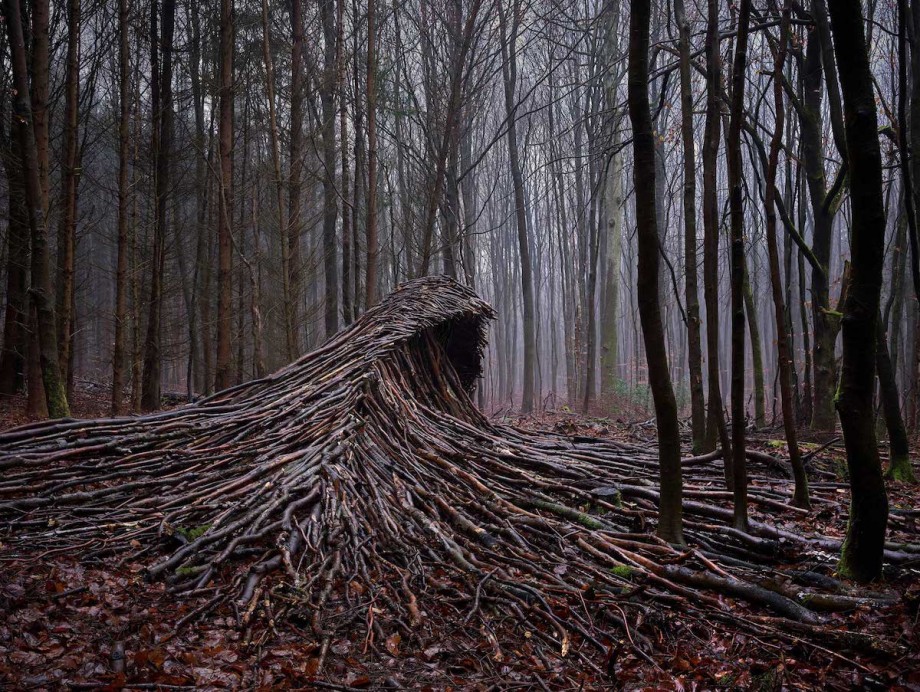 森の中に枯れ木を組み合わせて作った波のインスタレーション / Jorg Glascher