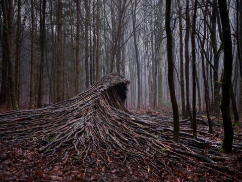 さんが、ハンブルグ近郊の森に枯れ木で作った波のインスタレーションです。たくさんの枯れ木を組み合わせて、森の中に大きくうねる波やゆらぐ水面を表現しています。