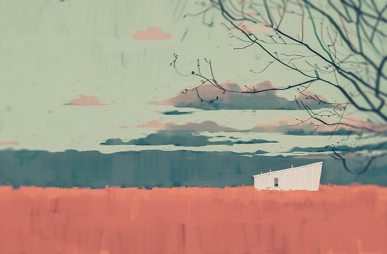 雄大な自然の中に小さな家が立つ美しい風景のイラスト / Darya Shnykina