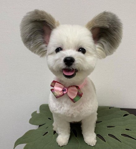 )です。マルタとパピヨンのミックス犬。ミッキーマウスのような、コアラのような、フワフワの大きな耳を持つ可愛い犬です。