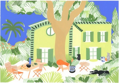 さんが夏の南フランスの暮らしを描いたイラストです。素朴なタッチの描写とカラフルな配色で、明るく開放的な南仏の風景を描いています。