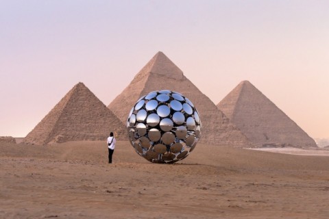 エジプト・ギザのピラミッドそばに展示された円形の鏡が集まる球体のインスタレーション / SpY