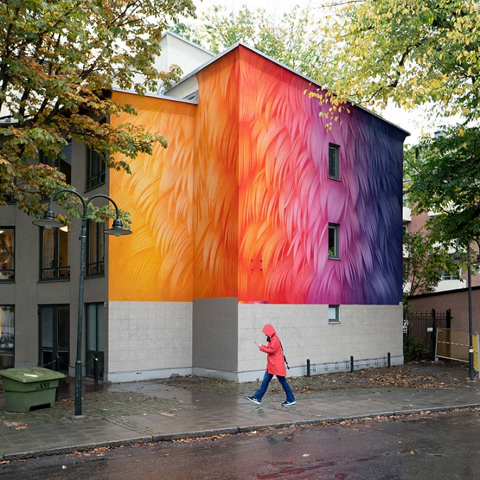 建物の外壁に色彩豊かに描く巨大な鳥の羽の壁画 / Adele Renault