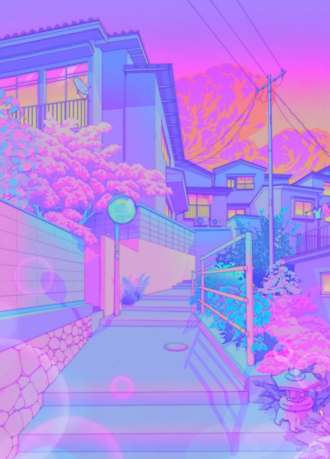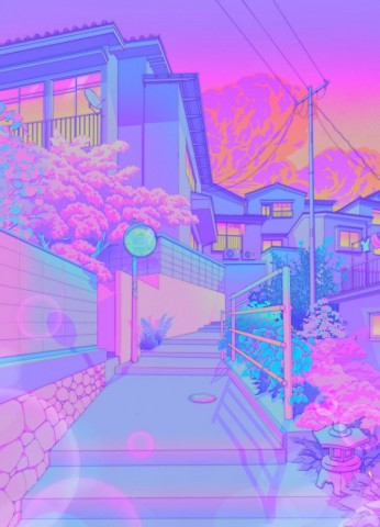 さんが、日本の街並みをパステルカラーで描いたイラストです。日本の人影のない静かな街並みを、カラーセラピーに基づいた落ち着いたパステルカラーで描いて、幻想的な風景に仕上げています。