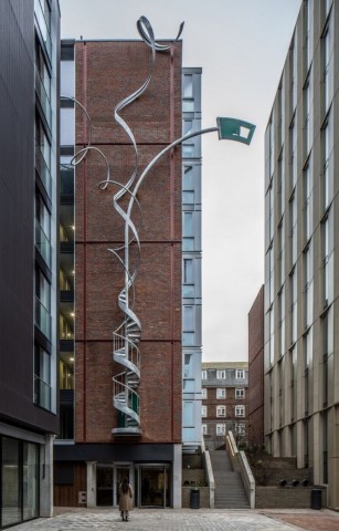さんが、英ブライトンの建物のファサードに手がけた、らせん階段をモチーフにした金属の彫刻作品です。亜鉛メッキ鋼で造られたらせん階段が、上方に向かって形を変えていく不思議な作品です。