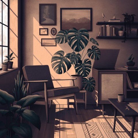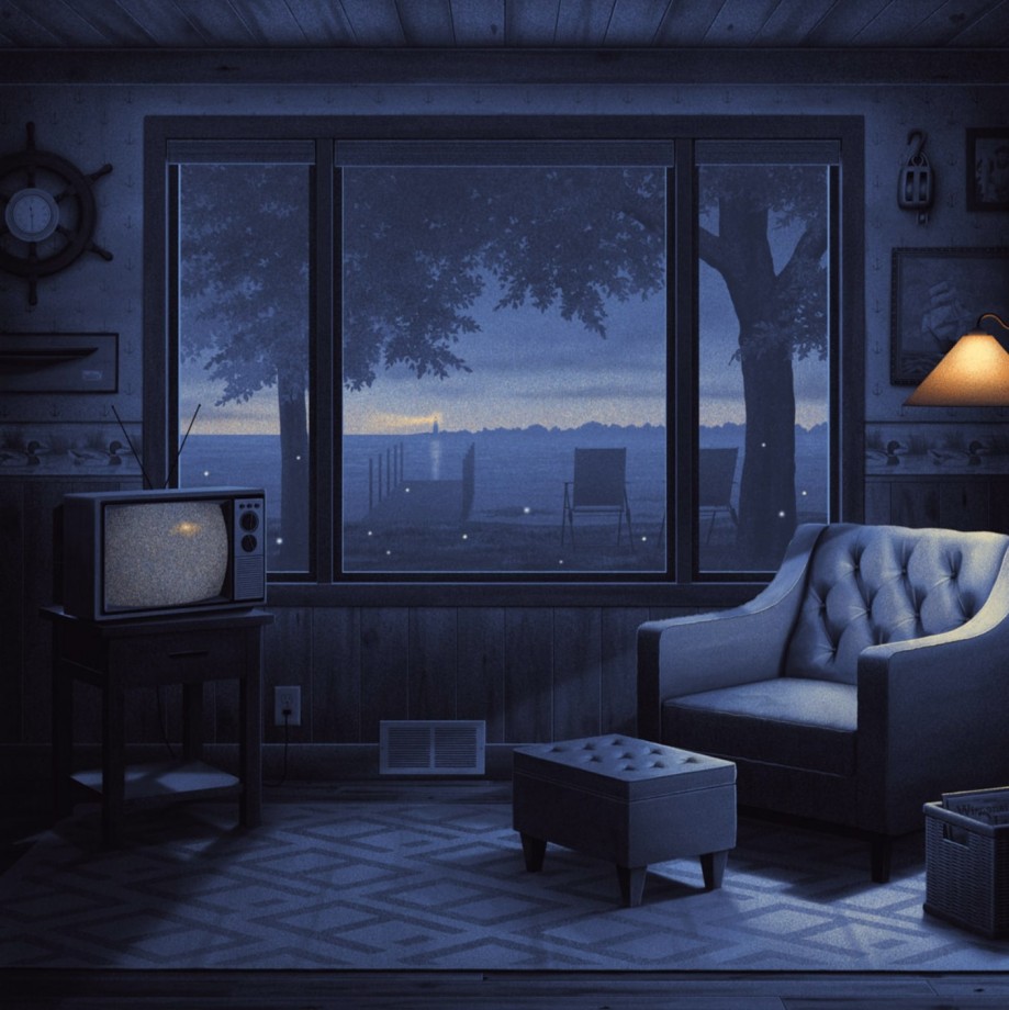 さんが描いた町の風景のイラストです。静かでしっとりと薄暗い、ノスタルジックな雰囲気が漂う町や部屋の風景を描いています。