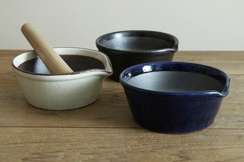 溝を取り去り、底面を平らに、側面は従来のものより切り立った形にすることで素材をすり潰しやすく、さらに器の外に逃げにくい構造にしています。
